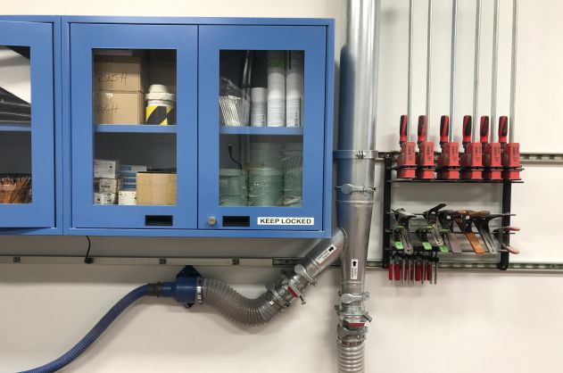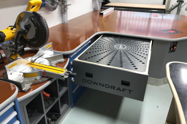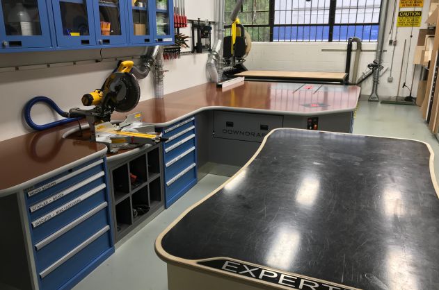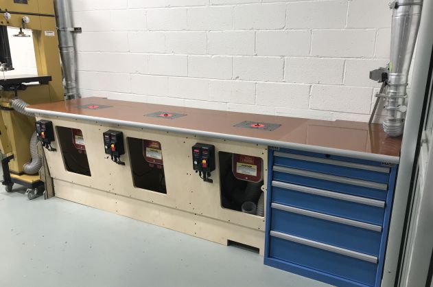 The second vital function is great utility – power, compressed air, water, heat/AC, and light. Walk into Ai Design and one immediately sees how well-lit it is. Bright, evenly distributed light is essential for our work. Power and compressed air lines are overhead, throughout the shop, and all workbenches are supported by strips of outlets. Heated in the winter and air-conditioned in the summer, the studio is comfortable, so work progresses with quality and focus.