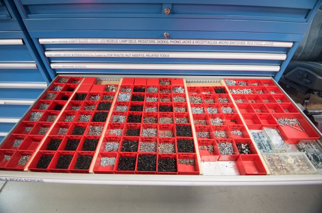 Our studio handles three crucial functions. The first is great storage – layers of it, compartments of it, oodles of it. This is critical. Proper storage allows for free-flowing work and saves time. We handle vast amounts of materials. These must be sorted, organized, dispensed, stored, retrieved, and used every day, all day. There are big parts, small parts, tiny parts, heavy parts, delicate parts, parts we may not need for another two months, the cars themselves, even the trash!