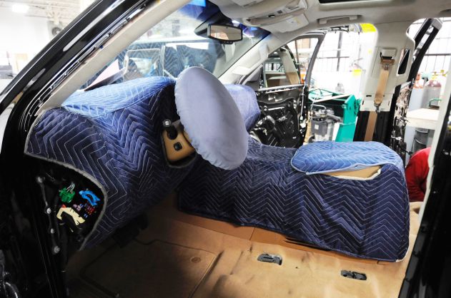 Depending on the scope and duration of a project, once the vehicle has been washed and inspected, we often apply protection to painted surfaces and delicate areas. Special plastics, tapes, foams, and quilted blankets are used for coverage.